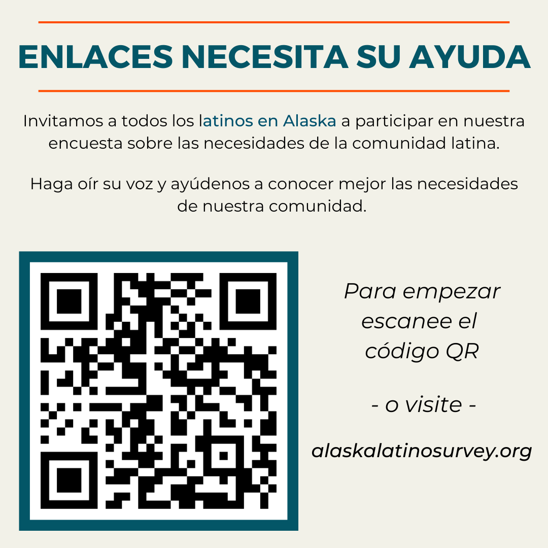 Enlaces mission is to empower, educate, and engage Alaska’s Latino community by acting as a catalyst for an equitable presence and voice. By collaboration with communities throughout Alaska, Enlaces works to advance social justice and equity for Latinos and Hispanics in the North.